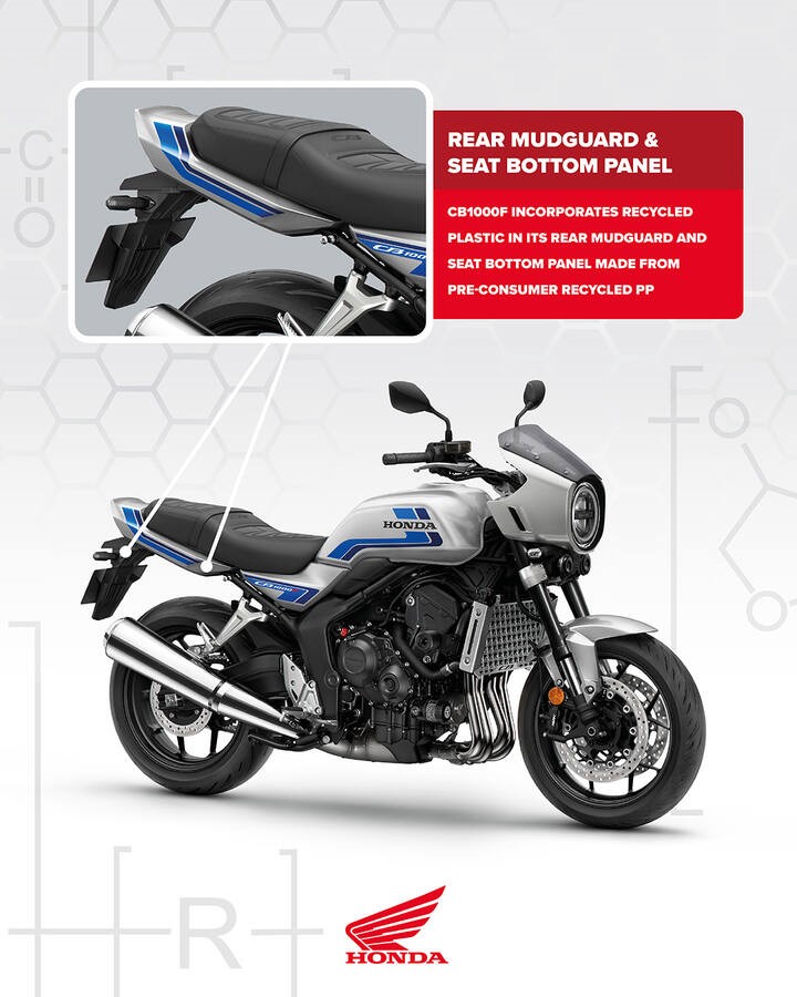 Επιπλέον, έξι μοτοσυκλέτες της Honda στην Ευρώπη διαθέτουν πλέον ανακυκλωμένα πλαστικά και DURABIO™, ένα βιο-βασισμένο τεχνικό πλαστικό που έχει αναπτυχθεί από τον Όμιλο Mitsubishi Chemical (MCG Group). Ήδη χρησιμοποιείται σε διάφορα μοντέλα, με ακόμη περισσότερα να ακολουθούν.
