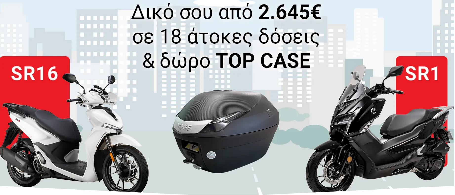 Συνεχίζεται η προσφορά της αντιπροσωπείας της Voge στα δύο δημοφιλή της σκούτερ, με δώρο ένα Top Case Voge της Givi, χωρητικότητας 34 λίτρων, ενώ ταυτόχρονα η απόκτησή τους γίνεται ευκολότερη με εξόφληση σε 18 άτοκες δόσεις