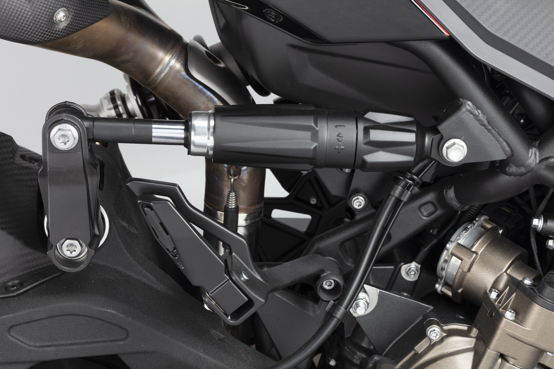 Το τηλεσκοπικό πιρούνι είναι ανάποδο και έρχεται από την Marzocchi, όπως και το πίσω αμορτισέρ, με τους τροχούς να είναι 15 ιντσών μπροστά και πίσω με διαστάσεις 120/70 μπροστά και 160/60 πίσω, ενώ το βάρος βρίσκεται κοντά στα 180 κιλά.