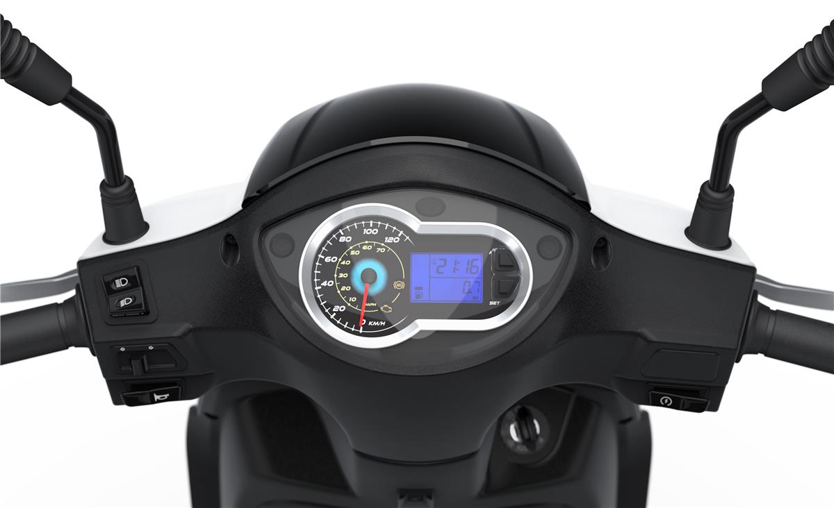 Ο εξοπλισμός διαθέτει αναλογικό και ψηφιακό πίνακα οργάνων, κεντρικό στάντ, και σχάρα αποσκευών, όπως και αποθηκευτικό χώρο κάτω από τησ σέλα.