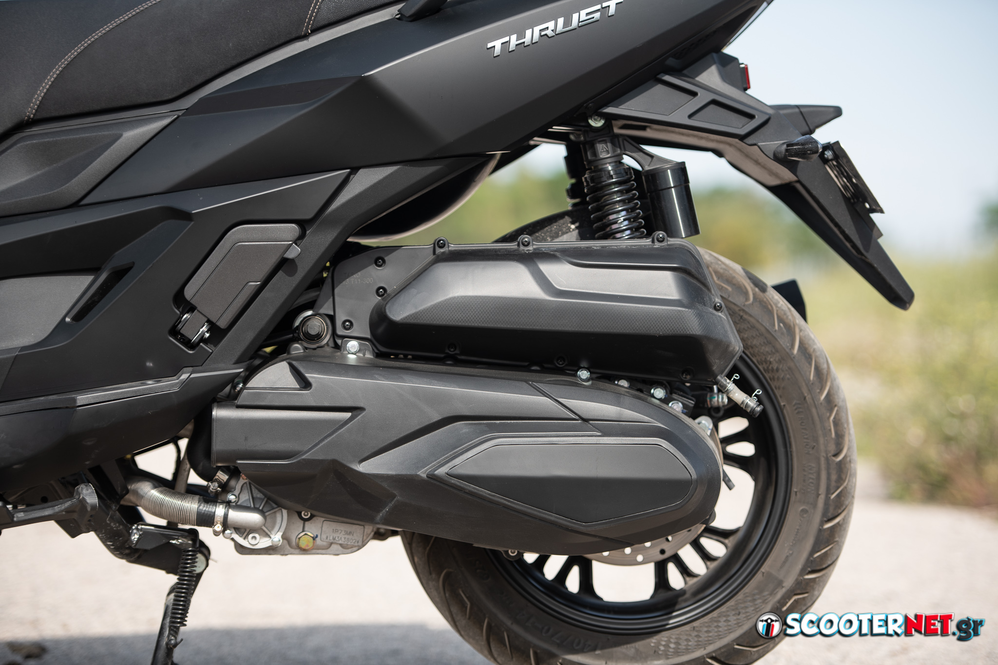 Κάτω από τη σέλα συναντάμε έναν μονοκύλινδρο, υγρόψυκτο, τετραβάλβιδο κινητήρα 278 cc, που αποδίδει 27 ίππους στις 8.000 rpm και 24 Nm ροπής στις 7.000 rpm, με αυτόματη μετάδοση CVT και Traction Control.