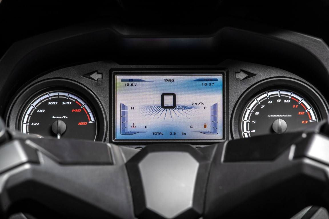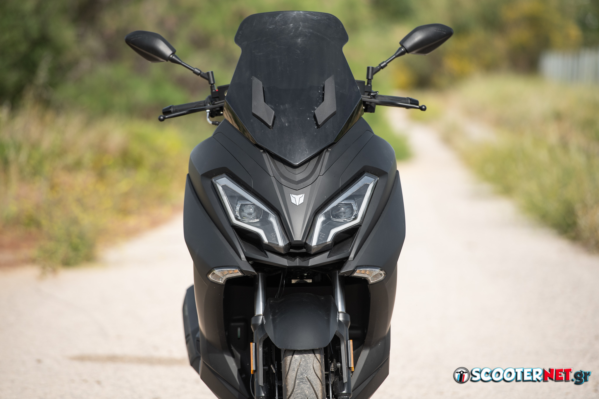 Το εμπρός μέρος ξεχωρίζει χάρη στην φαρδιά ποδιά που προστατεύει τον αναβάτη, όπου έχουν ενσωματωθεί δύο κομψοί προβολείς LED, πλαισιωμένοι από τα φώτα ημέρας (DRL).