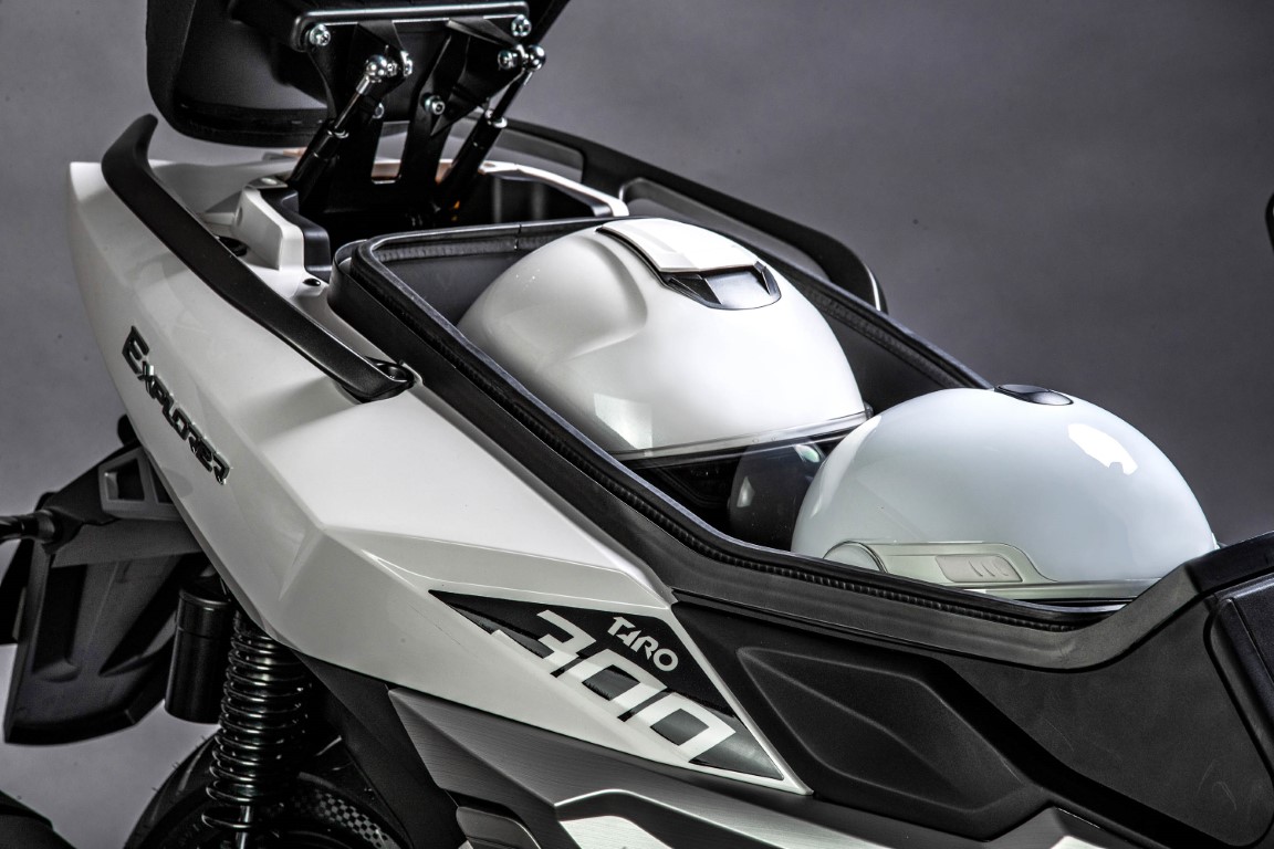 Στο Explorer 300 οι επιρροές από τη λογική των maxi σκούτερ είναι εμφανείς: το σώμα είναι σχετικά ογκώδες αλλά προσεγμένο, με έντονες αιχμές και μοντέρνα γεωμετρία.